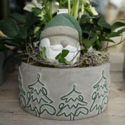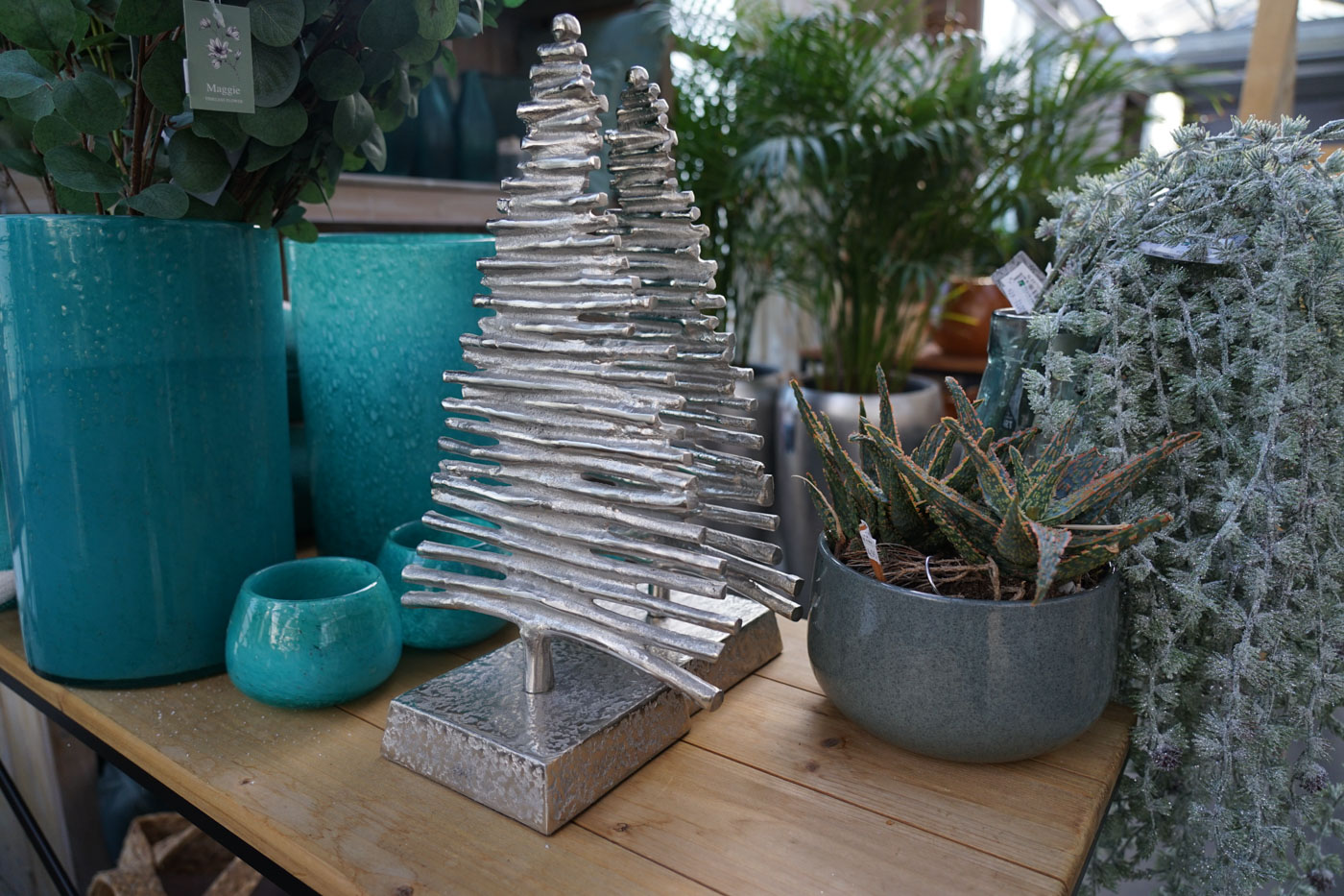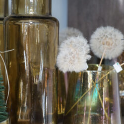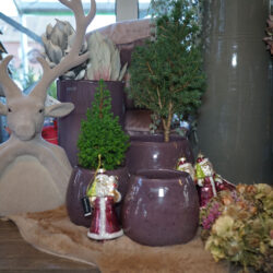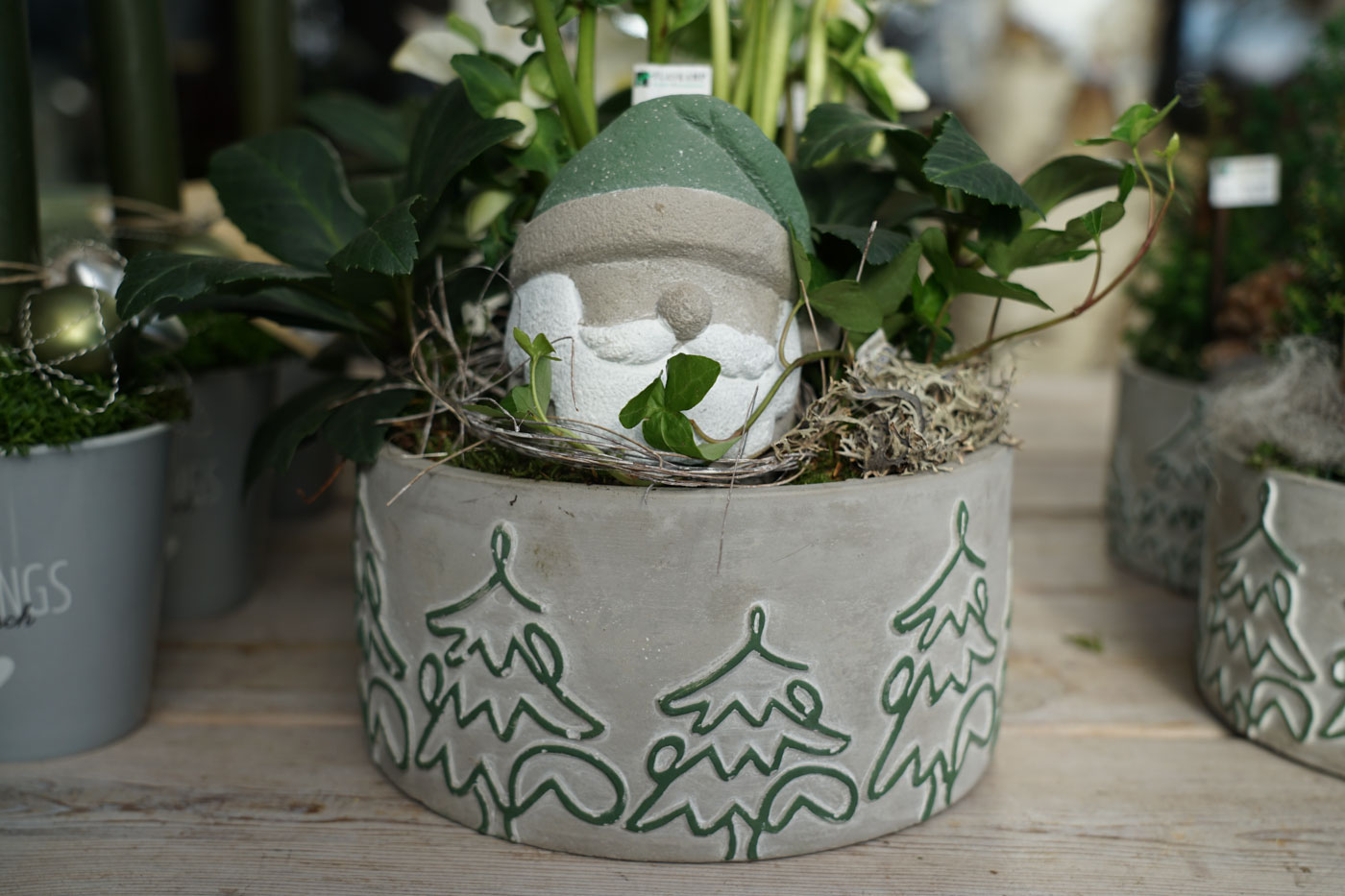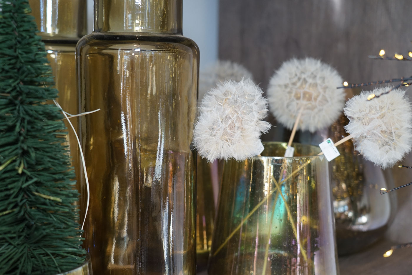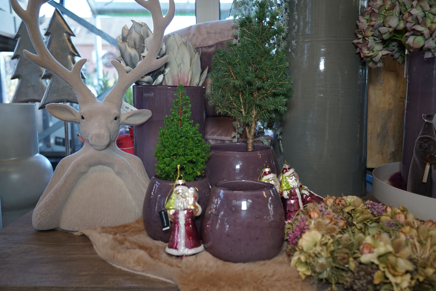 eine schlanke Vase in modischen Farben, ein opulenter Umtopf,